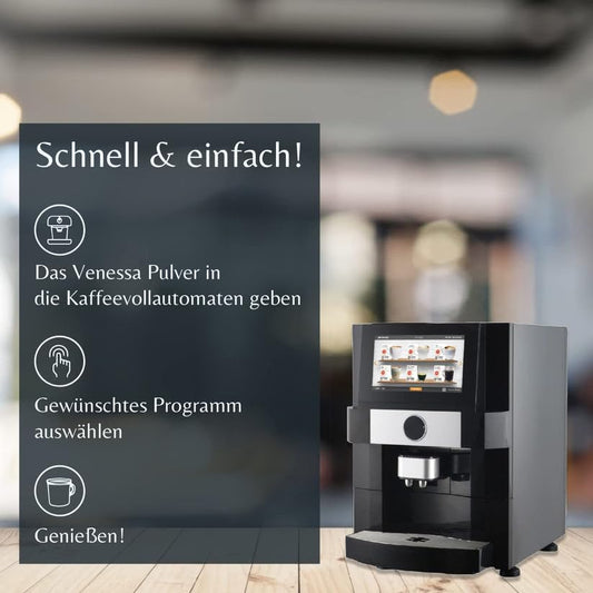 Feine Kaffee-Kreationen, die die Sinne verführen: Mit den VENESSA Cappuccinos erleben Sie bei jedem Schluck erstklassige Genussmomente. Die ausgewogene Kombination von Kaffee mit zarten Geschmacksnoten, die in keinem Automaten fehlen darf!